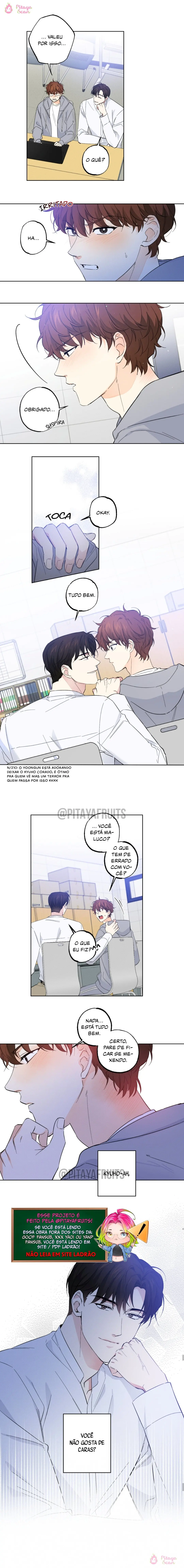 Ler o Manhwa Part-Time Partner em Português Grátis no Portal Yaoi “Kyuho, estou dizendo isso no caso de você ter me entendido mal, mas…” Shin Kyuho (25) e Seo Yoongun (25) se encontram em uma reunião de clube universitário. Shin Kyuho sente compaixão por Seo Yoongun, cuja aparência é do seu agrado (ou ‘que é do seu tipo’), enquanto Yoongun defende com confiança sua posição contra os veteranos do clube, deixando uma impressão favorável nele. Ele faz o possível para proteger Kyuho dos kkondaes* do clube, mas Yoongun parece ter formado um mal-entendido sobre isso… Um dia, o angelical Yoongun acaba dizendo algo embaraçoso. “Não sou desse jeito. Então… não tenha ideias estranhas.” Então, Yoongun faz Kyuho parecer um dos kkondaes* do clube. Posso ser gay, mas não é isso! Kyuho se sentiu oprimido e ridicularizado. Mas ele não era alguém que se deixava levar facilmente… “Agora vou te mostrar o que é verdadeiramente problemático, seu desgraçado.” O que acontecerá entre os dois em um campus onde as coisas se acirraram? *Kkondae: Gíria para alguém que age de maneira condescendente como um velho rabugento.